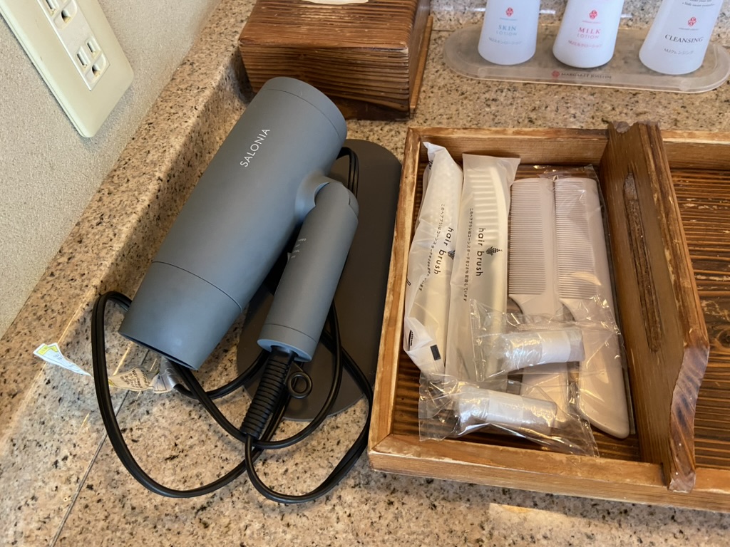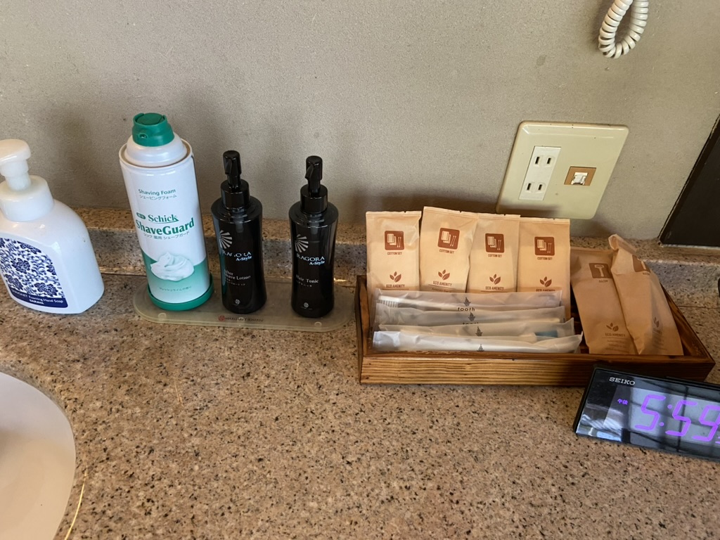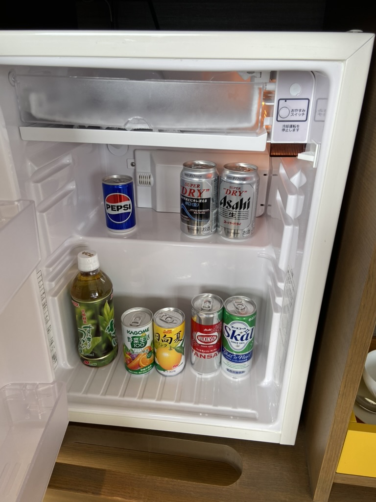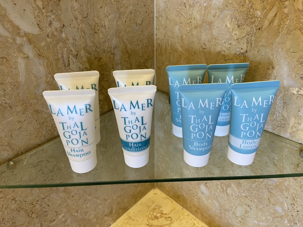 アメニティはタルボのシャンプー、コンディショナー、ボディーソープと、使い捨てのT字カミソリ、クシ、シェービングクリーム、乳液、などのスキンケアクリーム、そして小さな冷蔵庫にはドリンクが4本用意されていて、こちらもインクルーシブで無料。