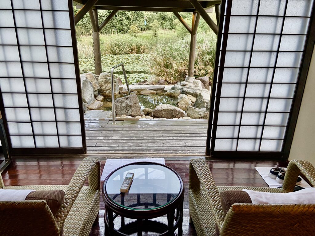 温泉の奥は蓮の葉の浮かぶ大きな池。その対岸には松林があり虫の声と風の音が心地よく響き心も踊ります。