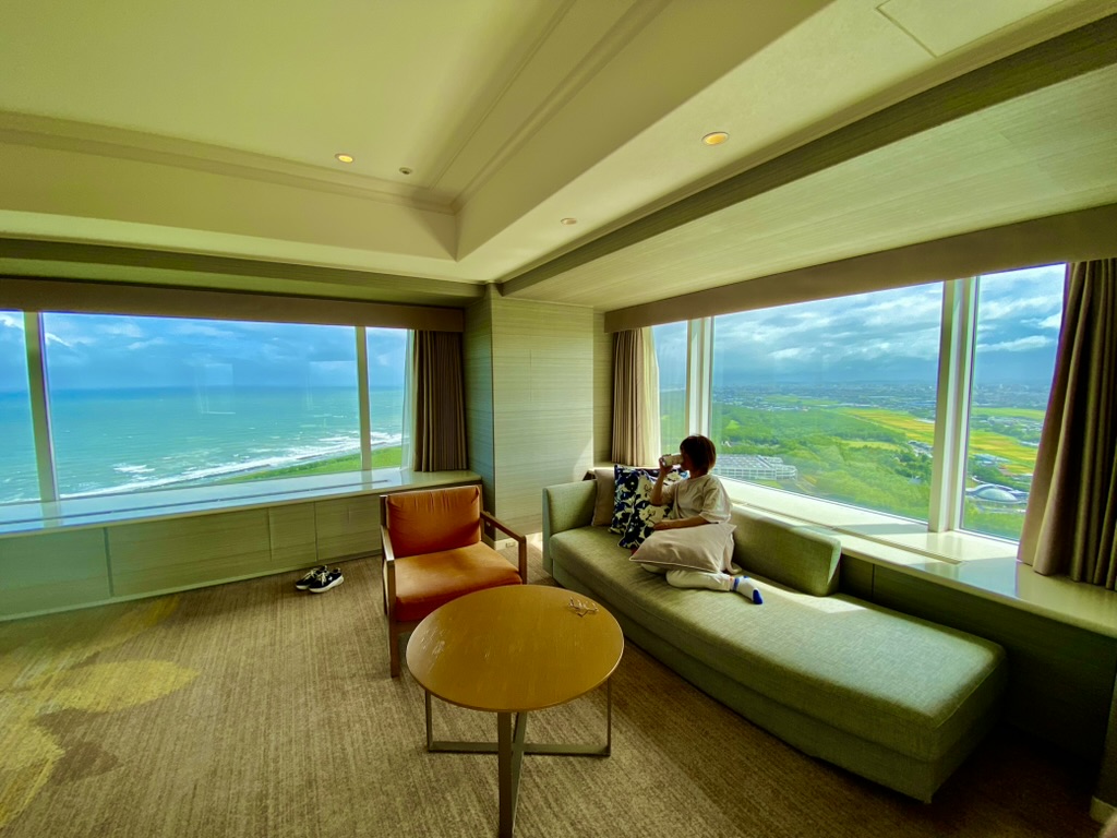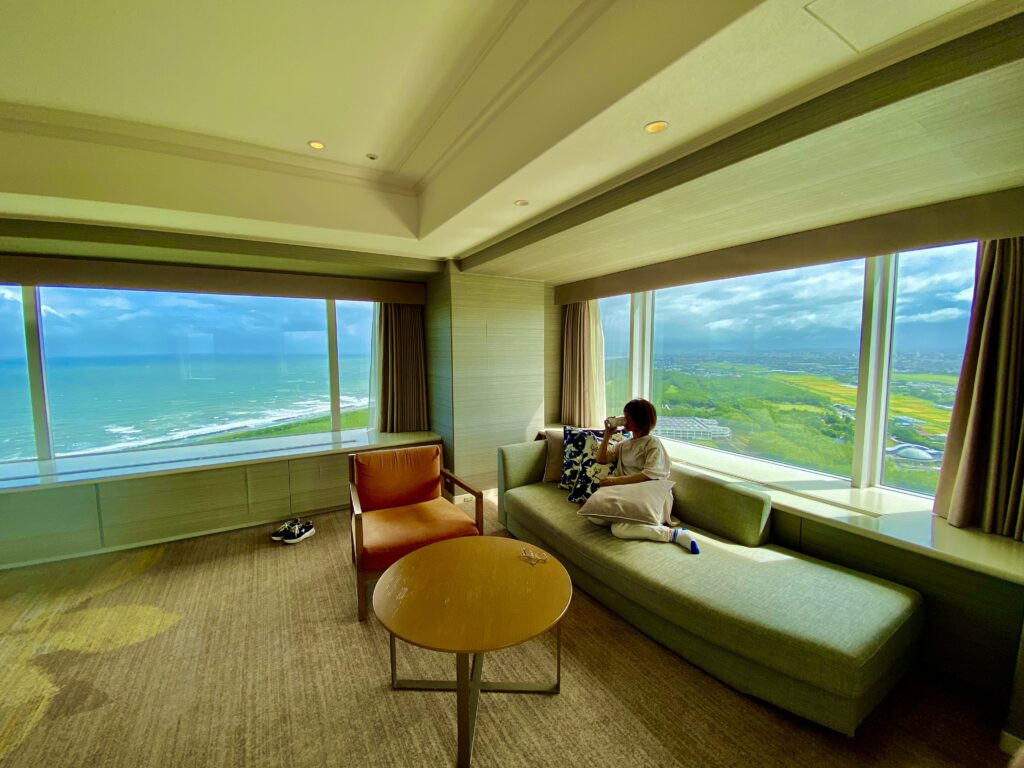 部屋の広さは109㎡でとても広々していて、南国みやざきらしい部屋の内装と、くつろぎ放題なおしゃれなソファーやインテリア。そして窓からの絶景!